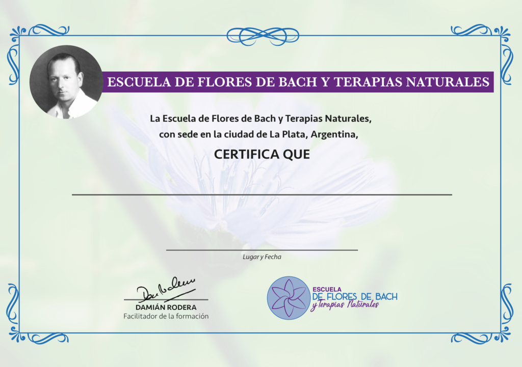 Al finalizar la formación -en cualquiera de las modalidades que hayas elegido- recibirás la certificación de TERAPEUTA FLORAL SISTEMA BACH, que será emitida por la Escuela de Flores de Bach y Terapias Naturales, con sede en La Plata, Argentina. La misma se enviará en formato PDF (en versión imprimible) a nombre de cada alumno/a. Para obtener la certificación se realizará un trabajo integrador final y el seguimiento terapéutico de un caso clínico que será enviado por correo electrónico al formador para su corrección, garantizando así que hayas integrado completamente los contenidos abordados durante la formación.